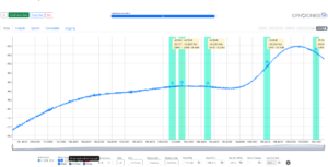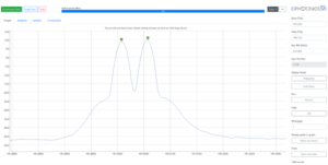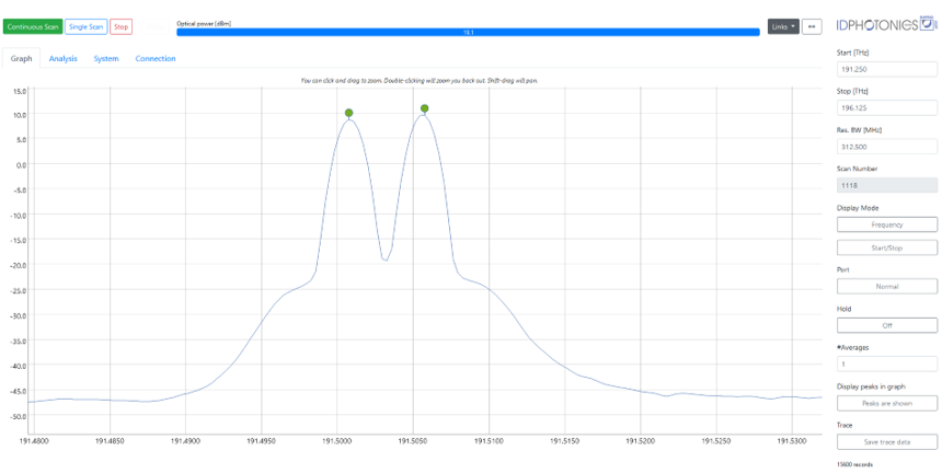 The ID OSA enables high-resolution spectral analysis of signals. This screenshot demonstrates the unit’s resolution by showing a measurement of two laser lines placed 5 GHz apart.