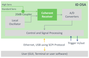 The ID OSA is an Optical Spectrum Analyzer based on coherent detection principles. Designed for versatility and efficiency, it provides picometer-class spectral resolution across the C-band or the L-band and completes full-resolution scans in just 0.5 seconds. With two input ports of different sensitivity, it boosts the available power range to more than 90 dB, allowing for accurate analysis of both low power signals and high power DWDM bands. Its compact and sturdy design, without any moving parts, makes it the ideal instrument for both research in the lab and production testing.